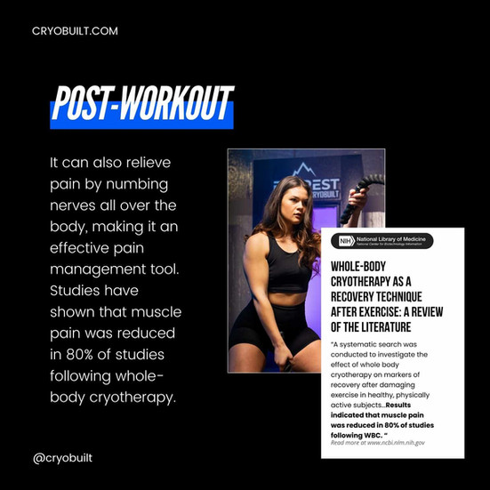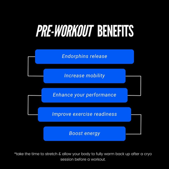 Cryotherapy is versatile enough to be incorporated into your fitness routine either before hitting the gym to enhance performance through increased alertness and circulation after your workout to accelerate recovery and reduce muscle soreness, or even both for comprehensive benefits. The user is completely dry during a cryotherapy session, making the session quick & convenient.